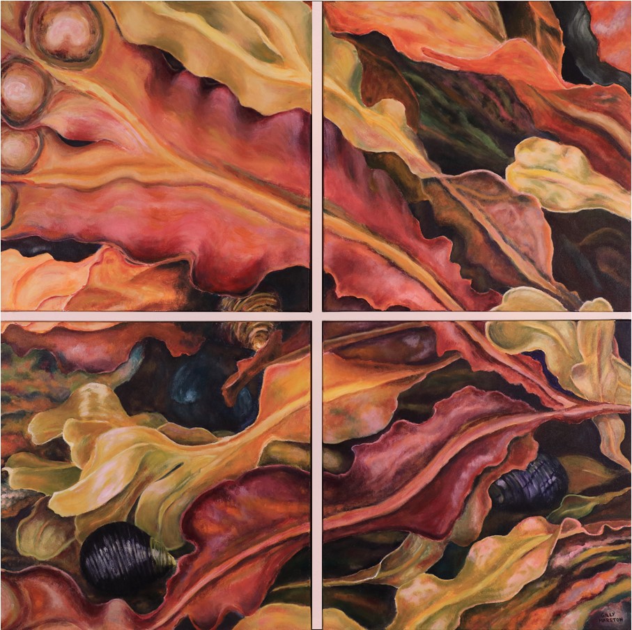 By reminding us of the beauty of these life forms, then and now, we are encouraged in our efforts to protect the ocean. The piece aims to show the wonderful richness of interconnected life in the secret world at the seashore. It is four fully painted panels which are each quite complete but together are fully complete.
